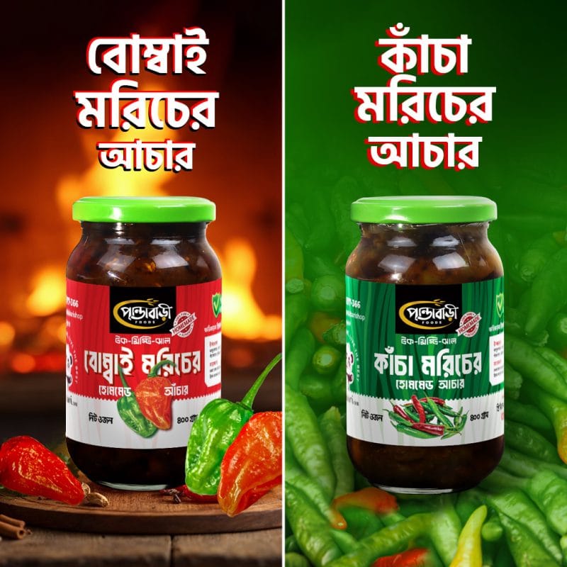 ❤️‍🔥 স্পাইসি লাভারদের জন্য বোম্বাই মরিচ আঁচার ও কাঁচা মরিচের কম্বো আঁচার—এটি একেবারে ঝালের চমক! 🔥🔥🔥 কাঁচা মরিচের টাটকা স্বাদ আর কিছুটা টক-মিষ্টি মশলার মিশেলে তৈরি করা এই আঁচার আপনার যেকোনো খাবারকে এক্সট্রা স্পেশাল করে তুলবে। আর যদি এক্সট্রা স্পাইসি লাভার হয়ে থাকেন, তবে বোম্বাই মরিচের আঁচারটি আপনার জন্য। 🔥 এর ঝাঁল এমন যে, একবার মুখে দিলে মনে হবে আগুনের গোলা! দুই আঁচারের এই স্পাইসি কম্বো গরম ভাত, পরোটা বা খিচুরি—সবকিছুর সাথে জমবে সেইরকম!